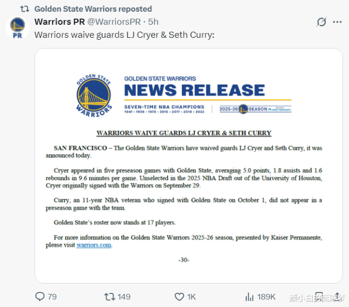 北京时间10月19日,勇士队官方宣布裁掉了LJ-克莱尔、塞思-库里,此举是让勇士队的阵容回归14+3,因为LJ-克莱尔与塞思-库里都是训练营合同。