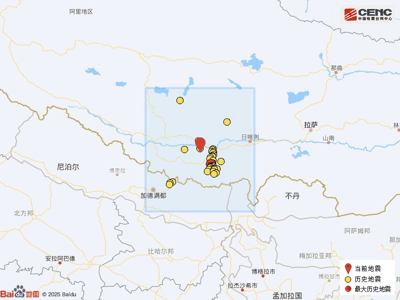 历史地震:根据中国地震台网速报目录,震中周边200公里内近5年来发生3级以上地震共131次,最大地震是2025年1月7日在西藏日喀则市定日县发生的6.8级地震(距离本次震中71公里),按震级大小前50次历史地震分布如图。