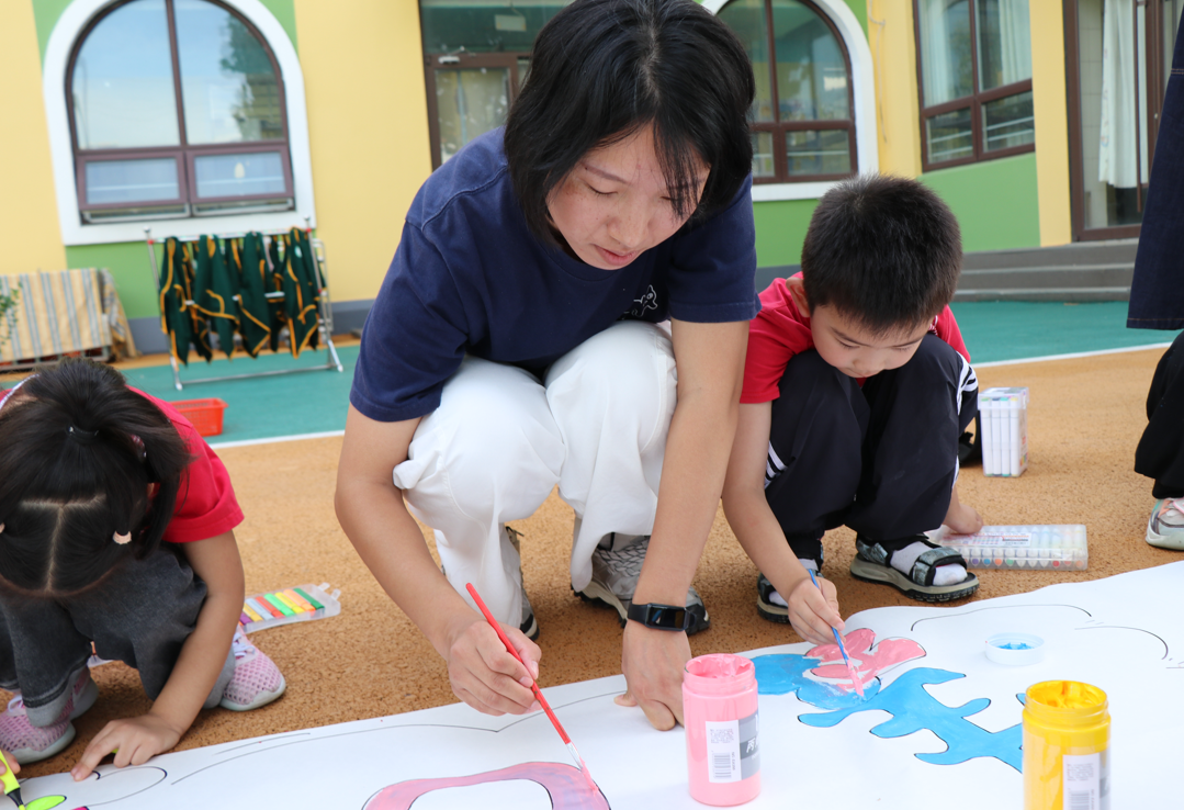 小班组聚焦“入园适应”,引导家长共同帮助新生缓解分离焦虑。亲子音乐律动、体育游戏及手作活动笑声不断,让孩子们在父母陪伴下快乐融入集体。中班组强调能力培养,教师与家长探讨如何有效互动,激发学习兴趣,并巧用AI技术打造趣味课堂,助力幼儿思维发展。大班组则围绕“幼小衔接”这一焦点,科学引导家长关注习惯养成与心理建设。活动特别设置了“喜迎国庆”亲子百米画卷环节,大小朋友共绘锦绣中国,爱国情怀在色彩间自然流淌。