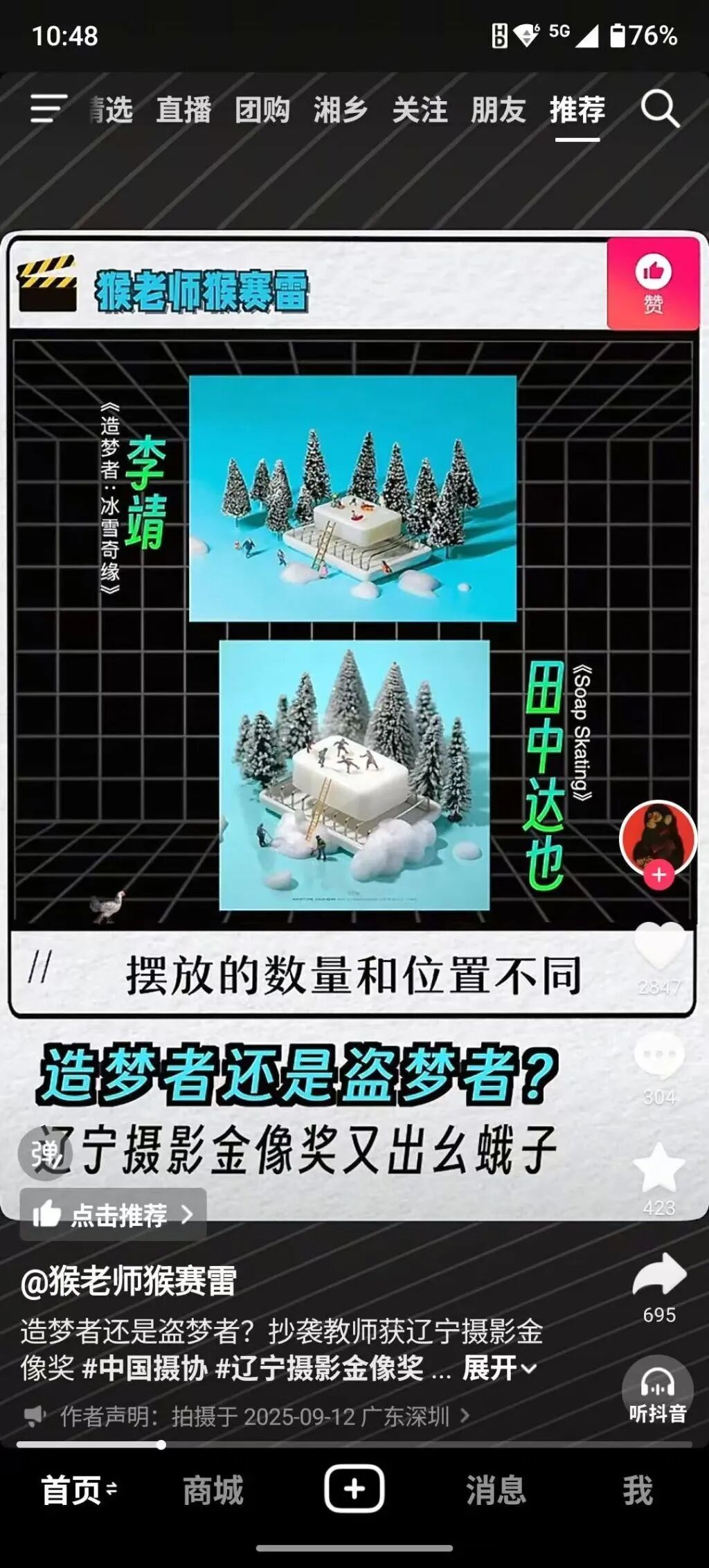 声明称,近日,组委会接到关于第八届辽宁摄影金像奖获奖者李靖部分参评作品涉嫌抄袭的举报。组委会高度重视,组织专家鉴定,认定其作品与他人作品高度相似,确定为模仿抄袭,研究决定取消李靖获奖者资格,收回相关荣誉,禁止参加辽宁省摄协举办的评奖和展赛。